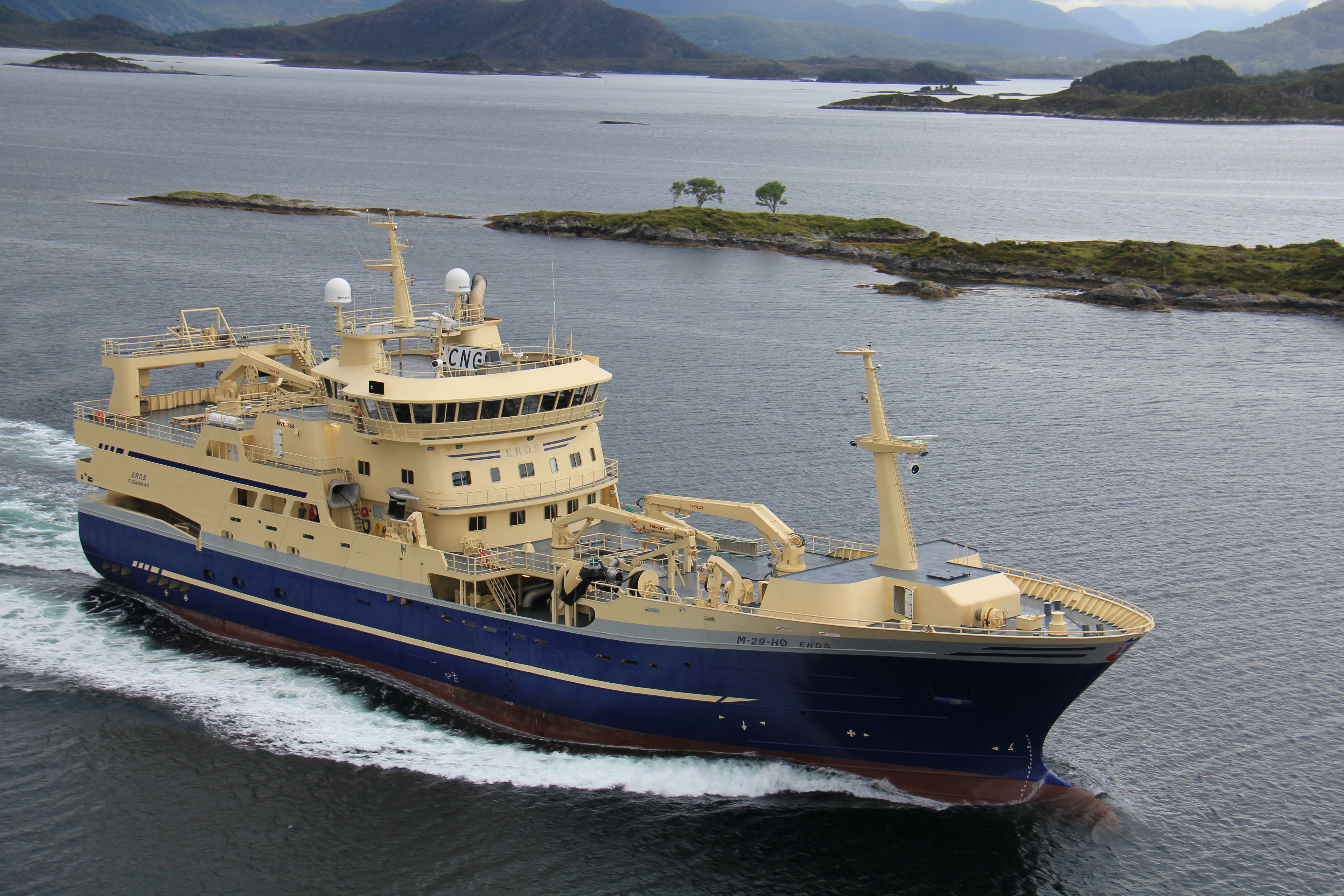 I oktober 2010 tegnet Eros-rederne kontrakt med Larsnes Mek. Verksted om bygging av en ny Eros. Båten skulle leveres juni 2012. Da dei fikk Eros i 1998 var dei enige om at båten var blant dem beste i si klasse. Men utviklinga går sin gang og nye ideer dukker opp, og man får lyst å investere i noe som er bedre. Dette har alltid vært et grunnprinsipp hos Eros-rederne. Hovedfokus for denne båten ble å bygge et fartøy som skulle stå sterkt i konkurransen om å få oppdrag fra Havforskningsinstituttet. Eros var tidlig ute, i 2007, med å skaffe seg innsatt senkekjøl som gjorde at båten ble attraktiv å låne for Havforskningsinstituttet. Men etter hvert var det flere som satt inn senkekjøl og konkurransen om å få slike oppdrag ble stor. Så denne nye Eros designes også med tanke på havforskning. Det var nødvendig med laboratorium og kontorfasiliteter av en helt annen standard enn det som var i den gamle Eros. I november 2012 ble den nye Eros levert fra Larsnes mek. Verksted. Dette var den sjuende båten i rekka til rederiet fra 1915-2012. 17. november 2012 ble båten døpt på Mjølstadneset i Herøy av gudmor Beate Remøy Eggesbø. Rederlaget hadde invitert til åpen båt, slik tradisjonen er i Herøy. Mange folk kom for å se. Det var lett å se at det va et fiskefartøy i en klasse for seg selv. Selv om det på fiske var vanlig med et mannskap på ti eller elleve hadde båten allikevel lugarplass til minst 30 personer. Tanken bak var at en ønsket å stille sterkt i konkurransen om å få oppdrag fra Havforskningsinstituttet. Nyebåten var utstyrt med både våtlaboratorium, algelaboratorium og tørrlaboratorium, også var det flere kontor i et nedsenket område på brua, som havforskerne også kunne benytte i arbeidet sitt. Eros var en av dem første båtene i ringnotflåten som hadde overbygd notbinge. Det gjorde at mannskapet kunne arbeide under tak, og at håndteringen av nota kunne foregå under full belysning inne i notbingen. Det gjorde arbeidet for mannskapet lettere, og bidro til en tryggere og mer trivelig arbeidsplass. Dei valgte også et nyutvikla notleggingsystem for overbygd notbinge. Dette fullautomatiserte leggingssytemet gjorde selvsagt arbeidet til mannskapet lettere og tryggere. Eros hørte på mange måter til en helt ny generasjon av pelagiske fartøy, spesielt innenfor miljø- og driftsteknologi. For å få best mulig driftsøkonomi ble Eros utstyrt med et hybrid fremdriftsystem. Det gjorde at dei både kunne kjøre dieselelektrisk og dieselmekanisk, eller en kombinasjon av begge. Eros var det første fiskefartøyet som fikk miljøsertifiseringen «green Passport». Denne sertifiseringen er et bevis på at det er benyttet miljøvennlige stoff og materialer under hele byggeprosessen. Denne båten drives fortsatt den dag i dag.